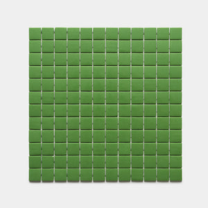 As the square tiles are cooled and removed from their molds, they are thoughtfully hand-placed on grids, in repeatable patterns and solid sheets. Whether solid, patterns, or a mix of the two, our vibrant collection and easy-to-install sheets allows for highly personalized installations.