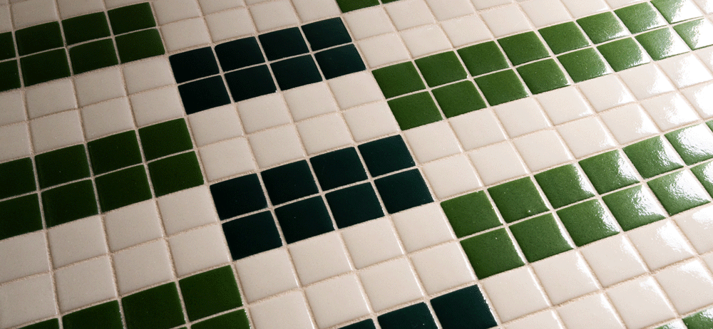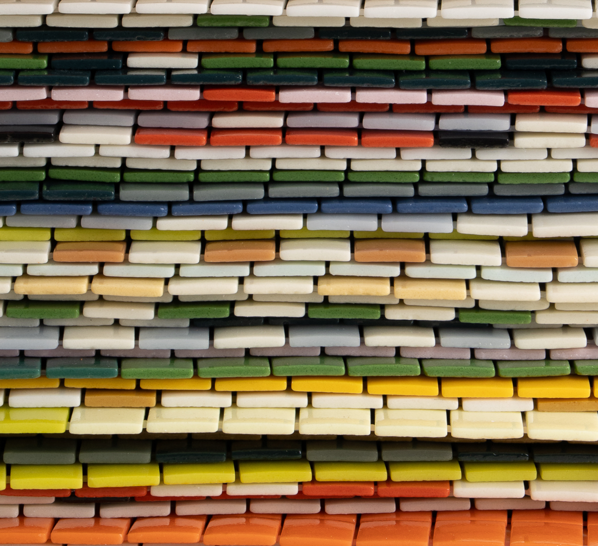 As the square tiles are cooled and removed from their molds, they are thoughtfully hand-placed on grids, in repeatable patterns and solid sheets. Whether solid, patterns, or a mix of the two, our vibrant collection and easy-to-install sheets allows for highly personalized installations.