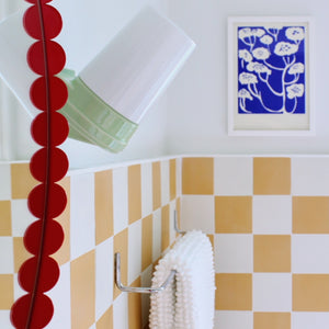 Cement tiles are made by hand, one at a time, using mineral pigments, cement, a mold, and a hydraulic press. The individual tile patterns are made by manually applying separate pigments, one by one, in a handmade brass mold. Cement tiles are not fired; there is no glaze layer on the surface of the tile. They derive their durability from the combination of finely dehydrated cement and a coarse sand and cement layer. The pigment layer is hydraulically pressed into the surface and becomes a part of the tile.